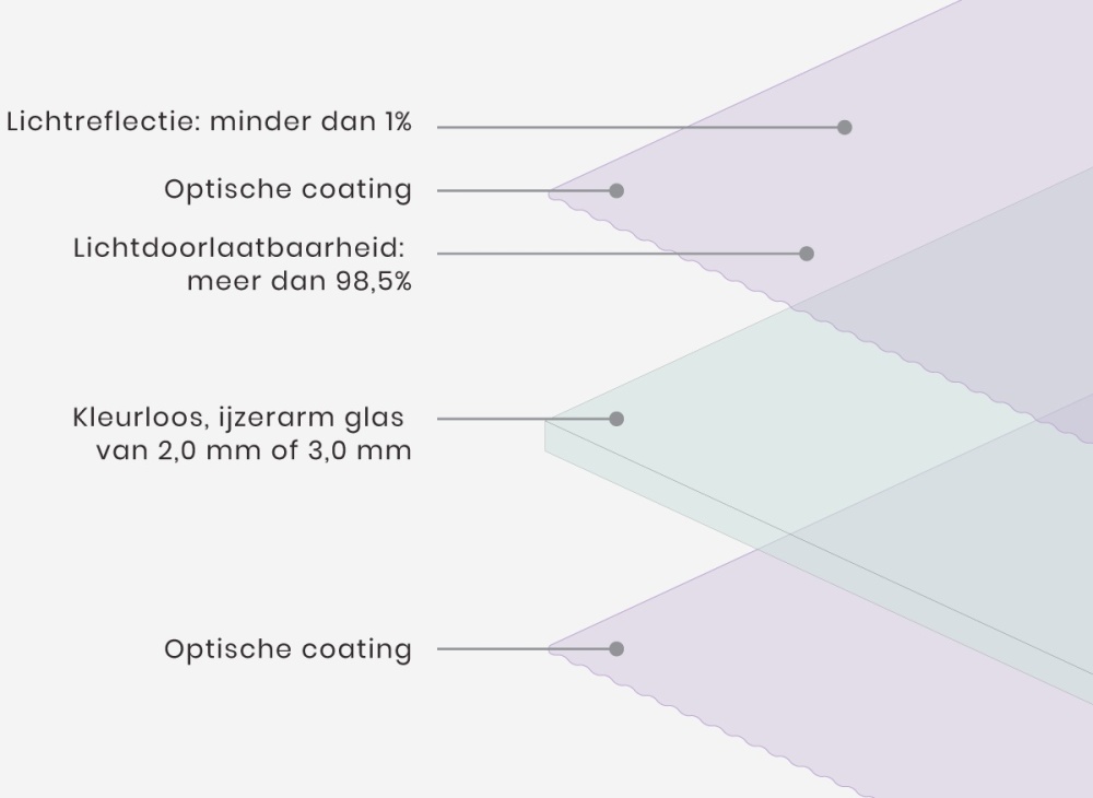 Deze beglazing met verhoogde doorzichtigheid is ideaal voor alledaagse projecten, voor lijstontwerpen met meerdere lagen passe-partoutkarton en om de driedimensionale aspecten van een baklijstontwerp te accentueren. Een lichtdoorlaatbaarheid van meer dan 98,5% betekent dat er geen kleurverschuiving is, terwijl het ontspiegelde oppervlak kijkers de mogelijkheid geeft om ieder detail te bewonderen zonder vervelende weerspiegelingen.